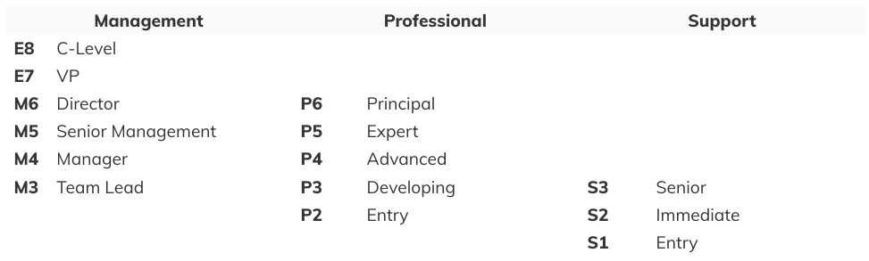We created a leveling system (see table below) to ensure as much uniformity across levels as possible. Each level has a clear definition outlined, as you can see in this overview. The overview also outlines the job titles per level. During data cleaning and analysis, some roles were re-leveled to fit the experience curve of the overall data properly. Extreme outliers were removed from the data to ensure compensation bands were not excessively large. In addition, not all roles can be reported on due to insufficient data points.